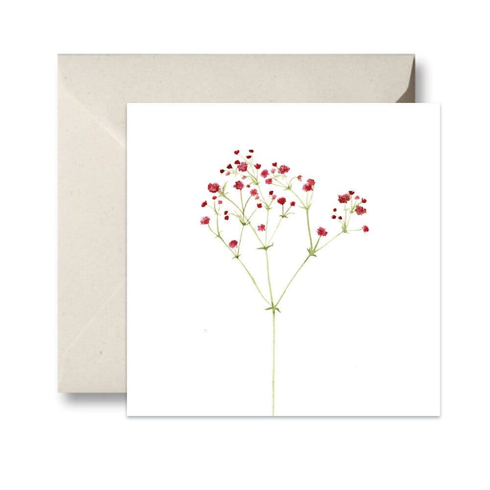 Een dubbele kaart inclusief envelop van een takje mooi en teer gedroogd roze kleurig gipskruid, Gypsophila. Deze maakt deel uit van de Dried Art Serie, een serie met gedroogde bloemen of grassen als onderwerp. De originele tekening is geschilderd met aquarelverf.