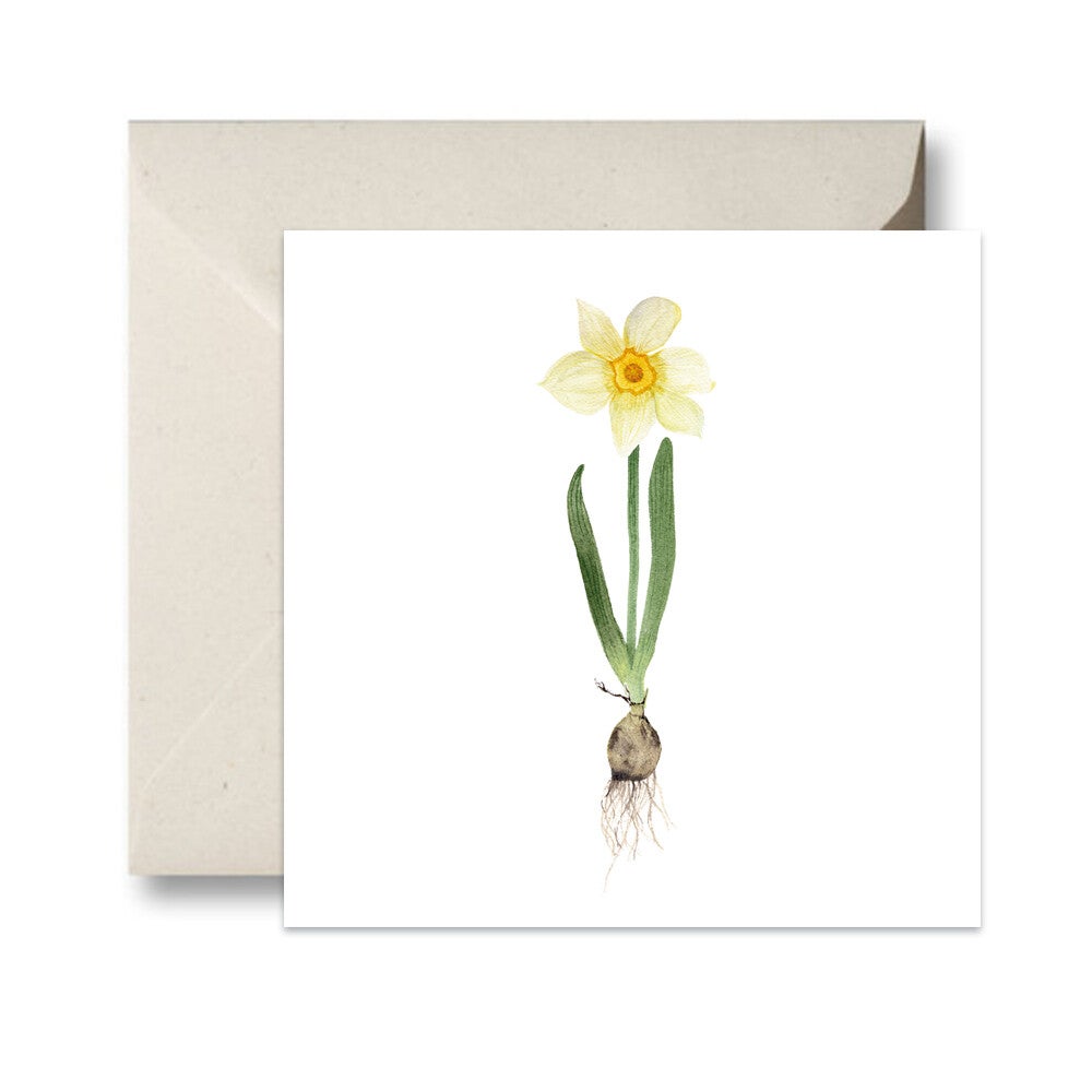 Een dubbel gevouwen kaart met envelop van een bloem van een Narcis. Deze kaart maakt deel uit van de Symbotanica Serie, botanische kaarten en hun symbolische betekenis. De narcis is ook de geboortebloem van maart.