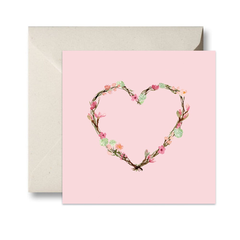 Een dubbele kaart met envelop van een hart met bloesem. De originele tekening is geschilderd met aquarelverf.