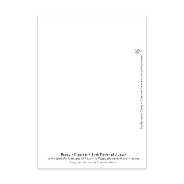 Een kaart van een bloem van een paarse klaproos (Papaver). Deze kaart maakt deel uit van mijn Summer Favourites en de Symbotanica Serie, botanische kaarten en hun symbolische betekenis, welke op de achterzijde vermeld staat.