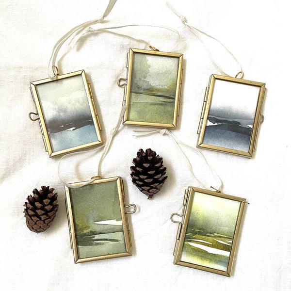 Mooie mini landschapjes in een goudkleurig hanglijstje. Deze landschapjes zijn origineel door mij geschilderd en dus iedere hanger is uniek. Mooi voor in de kerstboom of aan takken te hangen. Of om iemand speciaal een origineel cadeau te geven.
