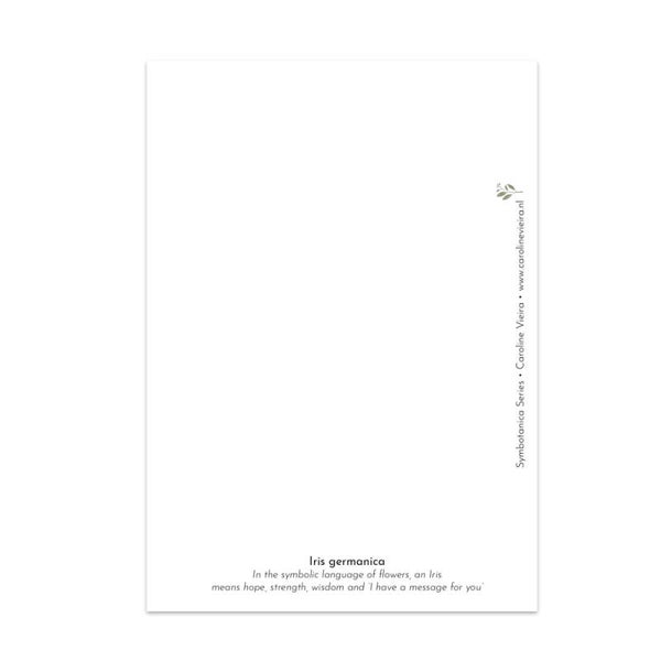 Deze kaart van een Iris maakt deel uit van de Symbotanica Serie, een botanische serie bloemen, planten of bomen met hun symbolische betekenis.