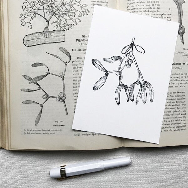 Set van 5 kaarten met Eucalyptus takken,rozenbotteltjes en een Mistletoe (Maretak). Het origineel is geschilderd o.a. met aquarelverf en inkt. De kaarten zijn verpakt in een mooi transparant, pergamijnen zakje.