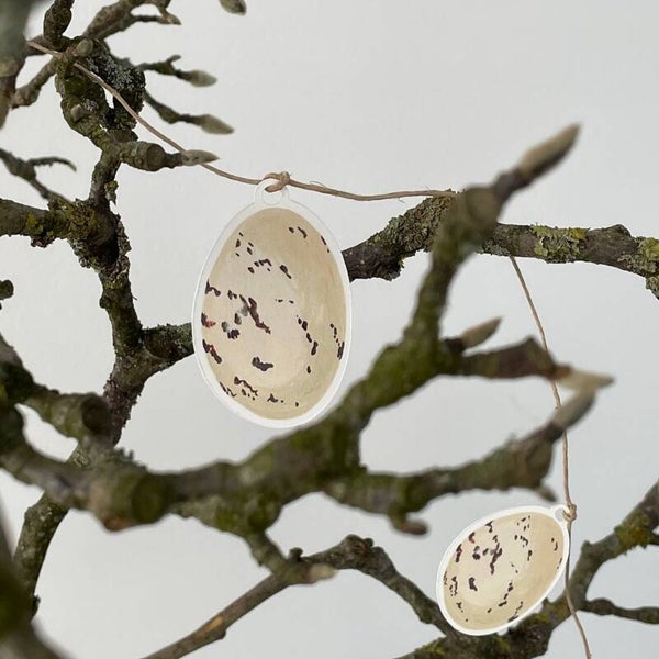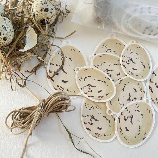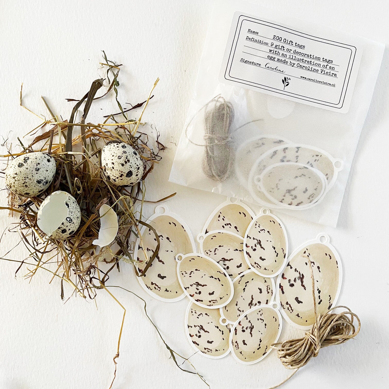 Een set van 9 ei-hangers voor aan voorjaarstakken te hangen of leuk om als label aan een kado vast te maken. Bestaat uit 3 grote en 6 kleine eieren.