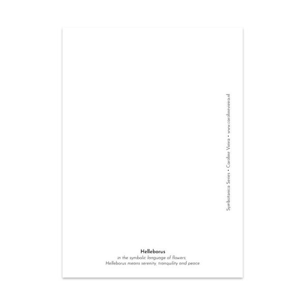 Een A5 Art Card van een Helleborus. Deze mini poster maakt deel uit van de Symbotanica Serie, botanische kaarten met bloemen, planten of bomen en hun symbolische betekenis.