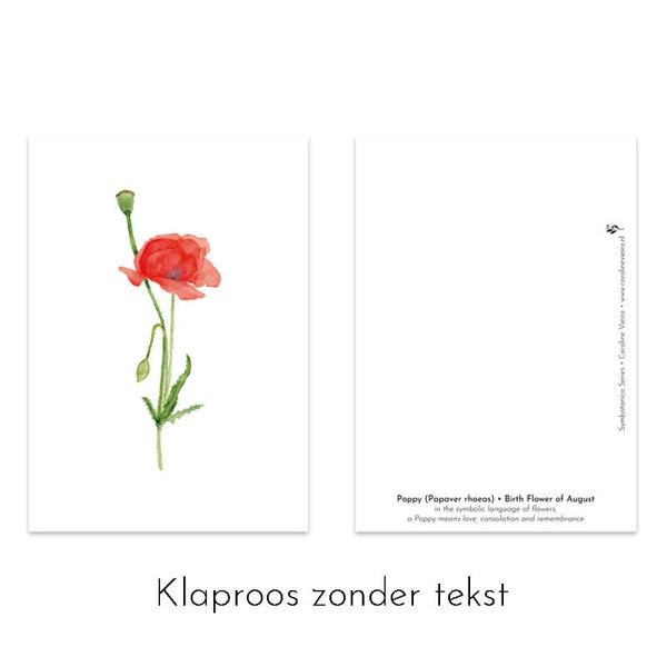 De klaproos is de geboortebloem van augustus (de symbolische bloem als je in augustus geboren bent) en heeft ook nog een mooie symbolische betekenis die op de achterzijde staat: