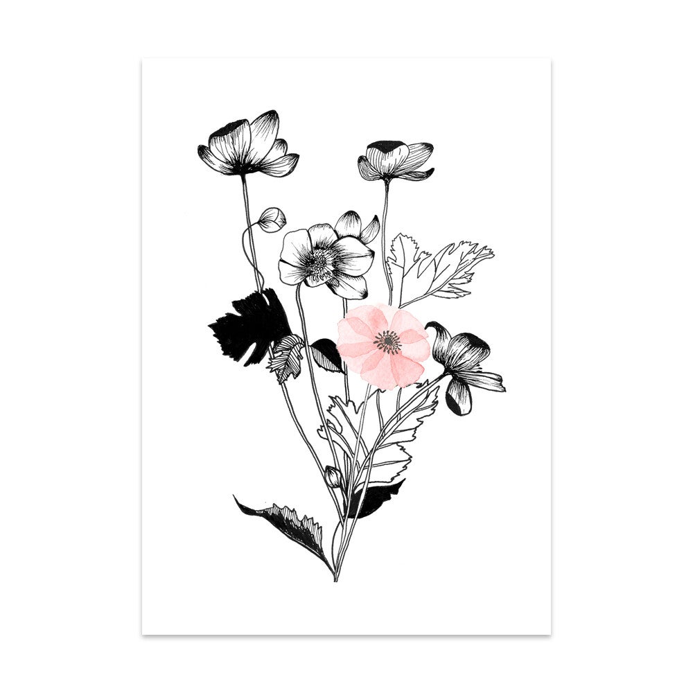 De originele tekening is getekend met fineliners en de bloem geschilderd met aquarel. Deze is vervolgens digitaal bewerkt voor de drukker en geprint op mooi papier.