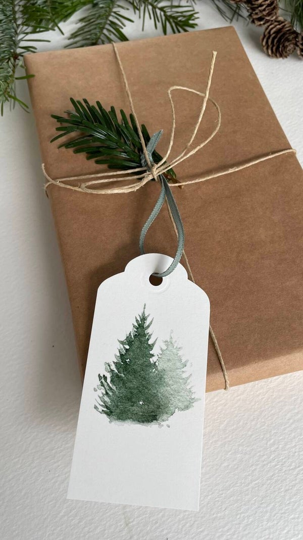Een mooie set van 5 sfeervolle cadeaulabels van de maretak, Eucalyptus, dennenappel en dennenboom. Met een luxe linnen lint.